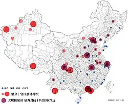 Die Proteste am letzten Novemberwochenende im Jahr 2022 stellten die größte Protestwelle in China seit der Studentenbewegung im Jahr 1989 dar.[17][18][19] Die Nichtregierungsorganisation Freedom House, US-amerikanischer Betreiber des China Dissent Monitor, schätzte, dass zwischen Samstag, dem 26. und Montag, dem 28. November 27 Kundgebungen stattgefunden haben.[20] Das australische ASPI-Institut (Australian Strategic Policy Institute) verzeichnete 43 separate Protestkundgebungen in insgesamt 22 Städten Chinas.[20] Nach Angabe des in Singapur ansässigen Medienportals Initium Medien kam es an über 70 Universitäten Chinas zu Kundgebungen.[21][22] Videos der Proteste fanden Verbreitung in den sozialen Medien.[23]