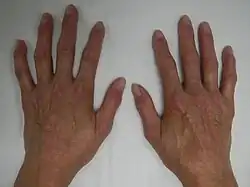 - Sklerodaktylie – straff gespannt und verhärtete Haut der Finger