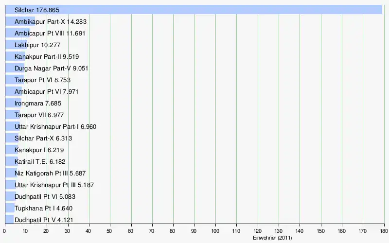 Wie überall in Indien wächst die Einwohnerzahl im Distrikt Cachar seit Jahrzehnten stark an[2]. Die Zunahme betrug in den Jahren 2001–2011 20,2 Prozent (20,19 %). In diesen zehn Jahren nahm die Bevölkerung um rund 291.000 Menschen zu. Die Entwicklung verdeutlicht folgende Tabelle: