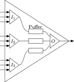 Ein -Merger ist rekursiv aus mehreren -Mergern zusammengesetzt (die Abbildung rechts zeigt einen 9-Merger): Es gibt insgesamt Eingabemerger , auf die die Eingaben gleichmäßig verteilt werden. Jeder Eingabemerger schreibt seine Ausgabe in einen eigenen Puffer der Größe . Dazu gibt es einen Ausgabemerger , dessen Eingänge mit den Puffern von verbunden sind und dessen Ausgabe auch die Ausgabe des -Mergers ist. Jeder der verbauten -Merger hat Eingaben und produziert eine Ausgabe von Elementen.
