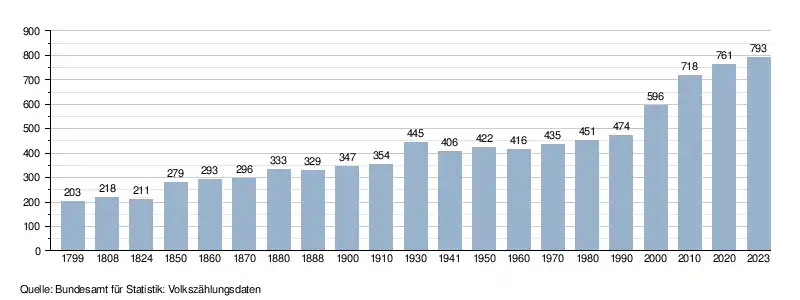 - ↑ Daten der Eidgenössischen Volkszählungen ab 1850 nach Gemeinden. (XLSX; 10 MB) Bundesamt für Statistik, Neuchâtel, 12. Juli 2024, abgerufen am 14. März 2025 (Öffnung in Excel nur über "Anhang/Excel-Datensatz" möglich).