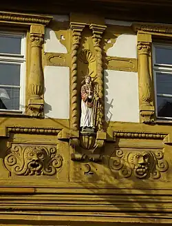 Das repräsentative zweigeschossige Haus besitzt ein steinernes Erdgeschoss und ein Obergeschoss in Fachwerkbauweise. Der zentral angeordnete Erker ist mit einer Zwiebelhaube gedeckt und von einem Dachknauf bekrönt. Die rundbogige Einfahrt erschließt die Neben- und Wirtschaftsgebäude im Hof. Das Obergeschoss mit sieben Fensterachsen ist mit ungewöhnlich reichem Zierfachwerk geschmückt. Die Eckständer haben aufwendig gearbeitete gewundene Dreiviertelsäulen mit Männerköpfen. Die übrigen Ständer zeigen gebuste Halbsäulen mit korinthisierenden Kapitellen. Auf den Brüstungsfeldern sind Fratzengesichter und über dem Tor Fruchtkränze dargestellt. Rechts außen vor dem letzten Fenster steht in einer Nische eine Skulptur des heiligen Laurentius, des Schutzpatrons der Bierbrauer, Köche und Wirte.