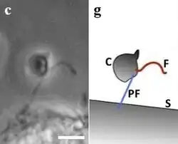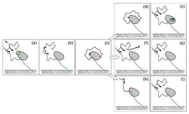 Schematische Darstellung der Nahrungssuche von C. roenbergensis oder C. burkhardae; a–c: Suche und Fang, d–e: Aufnahme der Beute bzw. f–g: Zurückweisung. Vordere Geißel (rot), hintere Geißel (blau), Aufnahmebereich (grüner Kreis), Nahrungsstrom (gekrümmte Pfeile), Objektbewegung (gerade Pfeile).Schematische Darstellung der Nahrungssuche von Cafeteria cf. mylnikovii (früher Pseudobodocf.tremulans); Bezeichnungen wie oben, zusätzlich h–i: Peitschen-Abstoßung (lash rejection). Die vordere Geißel dient als „Peitsche“.