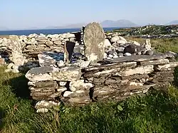 Caher Island ist Standort einer frühchristlichen Klosterruine mit den Resten einer Kapelle und einer Anzahl Cross-Slabs in einer Einfriedung.