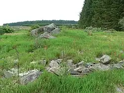 Um den Hügel wurden oberflächige Lagen eingeäscherter Knochen und Holzkohle gefunden. Eine in den gewachsenen Boden eingetiefte Grube enthielt einen kompletten Becher, der von Knochenkohle, einer Streitaxt sowie einem kleineren Gefäß aus schlecht gebranntem Lehm umgeben war.