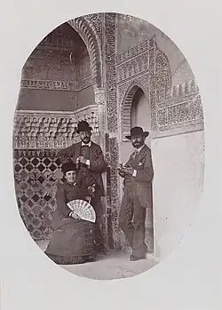 Curman mit Fächer und zwei unbekannten Männern auf dem Gelände des Alhambra-Palastes in Granada, Andalusien, Spanien (1878).