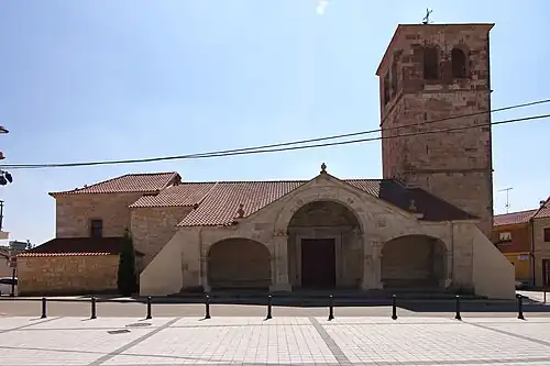 - Die Iglesia de Santa Elena wurde im 16. Jahrhundert an der Stelle eines mittelalterlichen Vorgängerbaus errichtet, von dem noch geringe Reste erhalten sind. Die triumphbogenartig gestaltete Vorhalle des Eingangsportals wurde im 18. Jahrhundert angefügt. Kirchenschiff (nave) und Apsis sind holzgedeckt; das spätbarocke Altarretabel (retablo) im Stil des Churriguerismus stammt ebenfalls aus dem 18. Jahrhundert.[6]