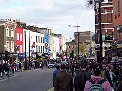 - Inverness Street in einer Seitenstraße der Camden High Street im Südwesten des Areals, wo zahlreiche Pubs und Bars angesiedelt sind.