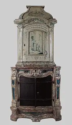 - ↑ Mathäus und Johann Friedrich Funk I (zugeschrieben), Bureau en armoire (sogenannter «Hölziger Ofen»), datiert 1743, 232,5 × 103 × 55,5 cm, Stiftung Schloss Jegenstorf, Inv. Nr. 1990, Nadelholz und Nussbaum, polychrom gefasst.