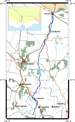 Von seiner Quelle in den Vorbergen der Great Dividing Range fließt der Fluss nach Norden und mündet bei Echuca in den Murray River.