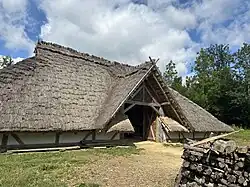Das Fachwerk des Gebäudes wurde von Praktikantengruppen der Jugendbauhütte Baden-Württemberg im Rahmen eines Freiwilligen Sozialen Jahres in der Denkmalpflege[14] und von mehreren Gruppen von Zimmerer-Lehrlingen unter Anleitung erstellt und aufgebaut. Das Dach ist mit Roggenstroh-Bündeln gedeckt. Die Wände bestehen aus Lehmflechtwerk, die mit Kalkmilch gestrichen sind. |