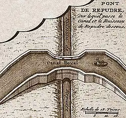 Vauban veranlasste den Bau etwa 50 weiterer Durchlässe kleinerer Bäche und von Aquädukten über die Flüsse Cesse und Orbiel. Beide Flüsse wurden zudem zusätzlich gestaut und konnten somit weiteres Wasser in den Kanal einleiten.[33] An den Kreuzungsstellen wurden die Freiborde der Bäche, Flüsse und des Kanals erhöht und begleitende Entwässerungsgräben angelegt.[3] Ein von Vauban entworfenes Aquädukt über den Orb wurde als „zu ehrgeizig und zu teuer“ nicht ausgeführt.[34] Die Kreuzung blieb weiter niveaugleich, war jedoch durch bereits von Vauban durchgeführte Änderungen offensichtlich bei Niedrig- und Hochwasser des Orb weniger störanfällig.