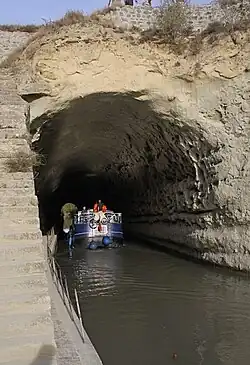 Aus der Gegenrichtung erfolgte die Fertigstellung des Kanals bis Béziers später. Der nahe Tunnel de Malpas wurde im Jahre 1679 begonnen und 1680 fertiggestellt.[24] Kurz nach Fertigstellung des Tunnels starb Riquet (1. Oktober 1680)[25] und erlebte somit die durch den König selbst veranlasste Inbetriebnahme des gesamten Canal du Midi im Mai 1681[24][26] nicht mehr. Seine Söhne führten restliche Bauarbeiten aus und erbten die Rechte zum Betrieb des Kanals.