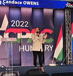 Am 9. April 2019 sagte Owens auf Einladung republikanischer Politiker im House Judiciary Committee aus, einem ständigen Ausschuss des US-Repräsentantenhauses.[24] Thema der Anhörung waren Hasskriminalität und der Einfluss weißer Nationalisten und ihrer Ideologie in den USA.[24][25] Owens bezeichnete diese Themensetzung jedoch als irreführend; tatsächlich gehe es den Demokraten nur um „Angstmacherei, Macht und Kontrolle“ (fear-mongering, power and control) durch die Zensur abweichender Meinungen.[24] Für Aufsehen sorgte insbesondere, dass der demokratische Politiker Ted Lieu sie mit einer Tonaufnahme konfrontierte, in der sie angeblich Adolf Hitler verharmloste.[26][25][27] Owens trat als Kommentatorin unter anderem beim US-Fernsehsender Fox News und in der Webshow von InfoWars, einem Onlineportal für Verschwörungstheorien, auf.[1][28] Für die konservative Organisation PragerU moderiert sie ab März 2019 die Talkshow The Candace Owens Show.[29][30] Im April 2020 kündigte Owens an, in der Zukunft ein politisches Amt anzustreben, entweder das einer Gouverneurin oder einer Senatorin.[31][32] Am 6. Februar 2021 gab sie per Twitter bekannt, „sie liebe Amerika und denke daran, für die US-Präsidentschaft zu kandidieren“.[33] Bei ihrem Twitter-Konto nutzt sie dasselbe Namensmuster wie Donald Trump, indem ein „Real-“ vor den eigenen Namen gestellt wird, was für Echtheit bürgen soll. Owens wechselte 2021 zu der rechtskonservativen Medienorganisation The Daily Wire von Ben Shapiro und moderierte die politische Talkshow Candace. Im März 2024 wurde sie nach einer Reihe von antisemitischen Kommentaren und monatelangen Spannungen mit Ben Shapiro und anderen Mitarbeitern von Daily Wire entlassen.[34]