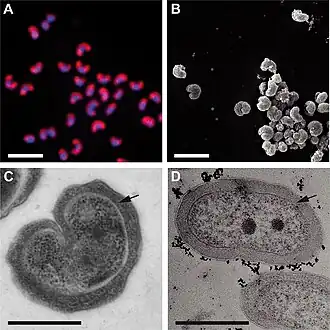 Morphologie von "Ca. Nitrotoga fabula". (A) Reinkultur von "Ca. Nitrotoga fabula„, visualisiert durch FISH mit der “Ca. Nitrotoga"-spezifischen Sonde Ntoga122 (rot) und durch DAPI-Färbung (blau). Balken, 2 µm. (B) Rasterelektronenmikroskopische Aufnahme nach chemischer Fixierung (Balken, 2 µm). (C und D) Transmissionselektronenmikroskopische Aufnahmen (nach Kryokonservierung [C] und nach chemischer Fixierung [D]; Balken, 0,5 µm). Schwarze Pfeile zeigen den periplasmatischen Raum an. | ||||||||||||