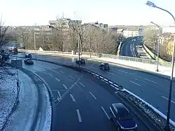 | Die beiden Äste der Candidstraße, im Vordergrund ein Teil der den Hang hinaufführenden S-Schleife, dahinter die in den Candidtunnel führende Hochstraße | |