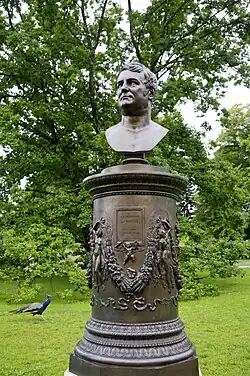 Bereits im Oktober 1854 teilte der Gartendirektor Oswald Heer mit, dass die Büste stark beschädigt sei und entfernt werden müsse. Er beauftragte Georg Hörbst, der bereits die Gessner-Büste hergestellt hatte, eine neue Büste zu modellieren. Diese wurde wohl 1855 in der Glockengiesserei Keller in Unterstrass gegossen und platziert. Als Material soll eine alte, obsolet gewordene Gessner-Büste aus Blei gedient haben. Ob es sich dabei um jene handelte, die angeblich 1799 von den Franzosen geraubt wurde, um Kanonenkugeln daraus zu fertigen, ist nicht ersichtlich. Vermutlich ersetzte man zur selben Zeit das Holzpostament durch den heutigen Sockel aus grauem Sandstein.[5]
