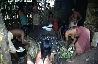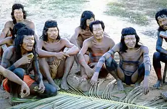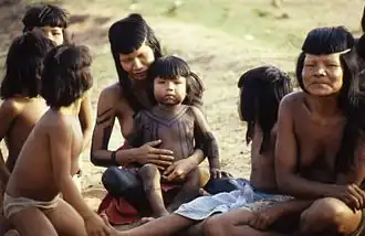 Bei der Geburt eines Kindes sind ausschließlich Frauen anwesend, der Vater ist nicht dabei, dafür seine weiblichen Verwandten. Die Mutter des Vaters fängt das Kind bei der Geburt auf.[38] Danach wird es gewaschen, mit roter Urucu-Farbe bemalt und seine Haare geschnitten.[39]