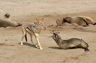 Schabrackenschakal (Canis mesomelas) und Südafrikanische Seebären (Arctocephalus pusillus), beide gehören zu den Hundeartigen. | ||||||||||||