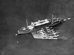 Die Canopus mit allen sechs U-Booten der U-Boot-Abteilung 17 in Apra Harbor, Guam, Oktober 1924