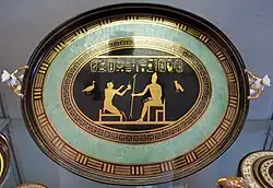 Die wiederbelebte neapolitanische Manufaktur stellte eine ähnliche Reihe von Produkten wie die alte Capodimonte Manufaktur her mit einer ähnlichen weichen Masse, die sie größtenteils wiederentdecken mussten. Sie stellten viele Genrefiguren und Tischware her.[38] Figuren der alten Themen vom Straßenleben nutzten jetzt mehr konventionelle Proportionen und sie waren eher komplett bemalt. Die Stile wurden beeinflusst durch einen generellen europäischen Geschmackswandel hin zum Klassizismus, intensiviert durch ein lokales Interesse an den ständigen Ausgrabungen in Pompeji, Herculaneum und anderen Stätten nahe Neapel. Tischservice wurden in einer großen Varietät von Revivalstilen produziert, einschließlich römisch, ägyptisch, und „etruskisch“. Die „etruskischen“ Stücke wurde von antiken griechischen Vasen abgeleitet, die in etruskischen Gräbern sichergestellt wurden und dann als etruskische Kunstwerke eingeordnet wurden.[39] Von 1782 war Domenico Venuti Direktor der Manufaktur, dessen Vater Marcello Venuti war für die königliche Sammlung der Antiken damals im Palast von Portici verantwortlich.[40]