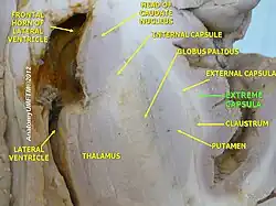 Die Capsula extrema ist eine dünne Schicht weißer Substanz zwischen Claustrum und Inselrinde (Insula). In ihr verlaufen Assoziationsfasern zwischen diesen beiden Hirnabschnitten.[1] Außerdem verlaufen in dieser Schicht Bahnen, die das Wernicke-Areal und das Broca-Areal verbinden, womit sie eine Bedeutung bei der Sprachverarbeitung hat.[2]