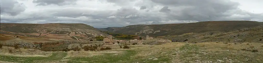- Die einschiffige und nahezu fensterlose romanische Kirche San Pedro hat eine gut erhaltene Südvorhalle (portico oder galería porticada), wie sie im Norden Spaniens (Provinzen Burgos, Soria, aber auch in der Umgebung von Segovia) häufiger vorkommt. Der Zweck dieser Vorhallen ist letztlich unklar – Wetterschutz, Gebets- und Wandelgang bzw. repräsentativer Eingang zur Kirche und/oder hoheitliches Ambiente für einen Versammlungs- und Gerichtsplatz der männlichen Bevölkerung. Die asymmetrisch angelegte siebenbogige Vorhalle zeigt eine gedrehte Säule mit vier Schäften sowie Kapitelle, wie sie ganz ähnlich auch im Kreuzgang (claustro) des etwa 70 km (Luftlinie) nördlich gelegenen Klosters Santo Domingo de Silos vorkommt; ein weiterer Bogen befindet sich an der östlichen Schmalseite der Vorhalle. Der Glockenturm der Kirche erhebt sich über einem Vorchorjoch unmittelbar vor der Apsis und wird begleitet von einem runden Treppenturm auf seiner Südseite.[7]