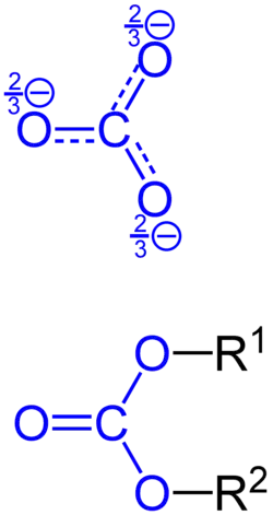 Die Ester der Kohlensäure mit der allgemeinen Strukturformel R1–O–C(=O)–O–R2, wobei R1 und R2 kohlenstoffhaltige Alkyl- oder Aryl-Reste sind, werden auch Carbonate genannt und unter Kohlensäureester beschrieben. Polymere Carbonate haben die allgemeine Strukturformel (O–R–O–C(=O)–)n und werden unter Polycarbonate behandelt.