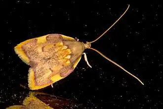 Die Schmetterlinge besitzen auffällig lange hellgelbe Fühler. Diese werden in Ruhestellung unter den Flügeln verborgen. Die Flügelspannweite beträgt zwischen 15 und 22 Millimetern.[3] Die hell ockerfarbenen Vorderflügel sind dunkel gesprenkelt und weisen eine violette Umrandung auf. Entlang der Costa nahe der Basis befindet sich ein gelber Fleck. Ein weiterer gelber Fleck befindet sich jenseits der Mitte am Flügelvorderrand. Entlang des Außenrandes befinden sich gelbe Fransen. Die Hinterflügel sind beige gefärbt.