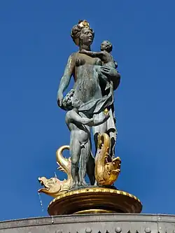Auf der Säule ruht wiederum eine bronzene Brunnenschale mit goldenen Ornamenten und Wasserspeiern. In der Schale steht auf einer weiteren, bronzene Säule die Caritas als Verkörperung der Barmherzigkeit und Nächstenliebe, die inzwischen ebenfalls aus Bronze besteht. Gleichsam einer Maria lactans tritt aus ihren Brüsten nährendes Wasser, anstatt Milch. Auf ihrem linken Arm hält sie ein Kind, mit der rechten Hand berührt sie den Kopf eines Jungen, welcher ins Becken uriniert. Er reicht ihr außerdem das Herz Jesu, aus dessen Flamme ebenfalls Wasser austritt. Zu Füßen der Figurengruppe befinden sich drei goldene Delfine.[3]