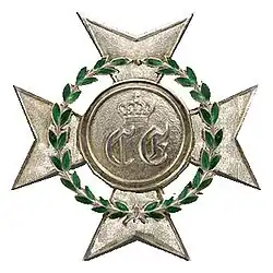 Das Ordenszeichen ist ein silbernes Steckkreuz in Form eines Johanniterkreuzes mit einem grünemaillierten Lorbeerkranz. In der Mitte des Kreuzes befindet sich ein großes Medaillon, welches die Initialen des Stifters C E zeigt, die von einer Krone überragt werden.