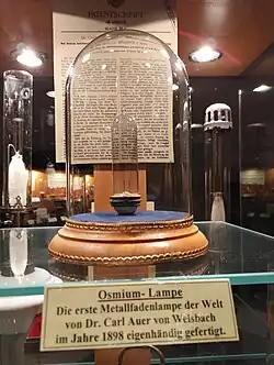 Auer beschäftigte sich auch mit Glühlampen: 1898 ließ er die erste brauchbare Metallfadenlampe patentieren. Er entwickelte dazu ein Verfahren zur Herstellung von Drähten aus Osmium (Patent 1890), das damals als das Metall mit dem höchsten Schmelzpunkt galt (Wolfram schmilzt bei noch höheren Temperaturen).[4]