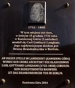 Seit 2014 erinnert in Kamienna Góra (Landeshut) eine Gedenktafel am Ort des nicht mehr existenten Geburtshauses an Carl Gotthard Langhans. Ein Teil des Stadtparks wurde nach Langhans benannt (skwer Langhansa Carla Gottharda).