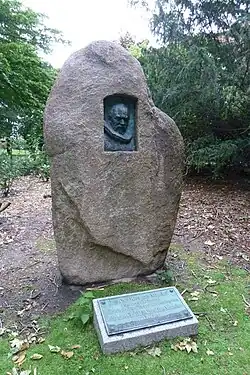 Granitfindling mit eingelassener Bronzeplakette von Stoltenberg-Lerche vor St. Gertrud