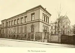 Verzeichnis der bisherigen Assistenten des Physiologischen Instituts seit dem Jahre 1867: Franz Schweigger-Seidel (1867–1871), Gustav Hüfner (1869–1872), J. J. Müller (1869–1871), Hugo Kronecker (1871–1876), G. A. Schwalbe (1872–1873), Edmund Drechsel (1872–1892), Paul Flechsig (1873–1878), Johann von Kries (1877–1880), Justus Gaule (1878–1885), Max von Frey (1880–1897), Franz Hundeshagen (1883–1885), Paul Starke (1885–1886), Ludwig Reese (1885–1888), Otto Drasch (1886–1889), Max Siegfried (ab 1888), Rudolf T. Metzner (1889–1890), Paul Starke (1890–1891), Richard Mosen (1891–1892), Hugo Welzel (1891), Otto Frank (1892–1894), Alfred Schützhold (1892–1894), Hans Wislicenus (1893–1894), Paul Balke (1894–1897), Wilhelm Massot (1894–1895), Siegfried Garten (1894–1908), Franz Hofmann (1895–1905), Volkmar Störmer (1897), Richard Burian (1897–1905), Armin Tschermak (1898–1899), Alfred Noll (1899–1900), Friedrich Nicolai (1901–1903), Johannes Rietschel (1901–1902), Walter Sülze (1903–1909), Ernst von Brücke (1905–1909), Rudolf Dittler (1905–1909).[29]