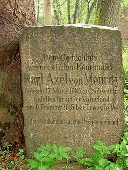 - Dem Gedächtnis der im Weltkriege gefallenen Mitglieder der von Monroy’schen Familie. Karl Axel von Monroy † 6. Febr. 1915. Ernst Ludwig von Monroy † 26. Sept. 1914. Schwerin 1916.