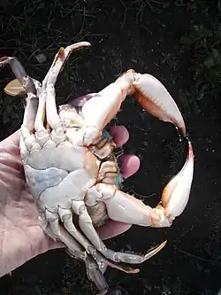 - Der Carapax, die harte Bedeckung der Körperoberseite, ist flacher als er breit ist und besitzt seitlich überstehende Ränder.