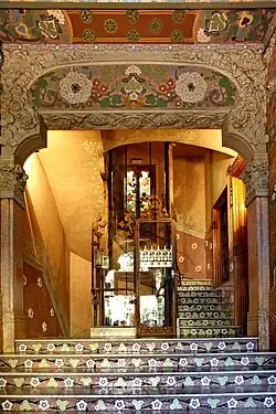 Der Treppenabsatz im zweiten Teil zeigt römische Mosaike mit geometrischen Motiven. Die Wände hier und auch im Treppenhaus sind im gleichen Lachston gehalten und besitzen helle Sgraffitobordüren. Die Sockel sind mit plastischen weißen Keramikblüten verziert, die das Blumendekor der Setzstufen der Treppe aufnehmen. Alle Mosaiken im Foyer und entlang der Treppe sind das Werk von Lluís Brú i Salelles[27]. Der aus Holz gefertigte Aufzug im Stil des Modernisme wurde an die heute geltenden Vorschriften angepasst, ohne jedoch sein ursprüngliches Aussehen zu verlieren.