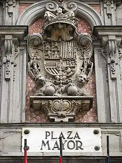 Über der mittleren Arkade prangt ein aufwändiges barockes Wappen aus der Zeit Karls II. (reg. 1665–1700), das auf zwei liegenden Löwen aufruht, die ihre Pranken auf (Erd-)Kugeln gelegt haben. Im oberen linken Feld findet sich das Wappen von Kastilien (Burg) und León (Löwe); rechts daneben die Wappen von Aragón (senkrechte Streifen) und Sizilien (senkrechte Streifen und Adler). Unten links erscheinen die schrägen Streifen von Burgund und die waagerechten von Brabant, daneben die Wappen von Flandern und Tirol. Das Ganze ist gerahmt von der Ordenskette des Ordens vom Goldenen Vlies; das Widderfell befindet sich genau zwischen den beiden Löwen.