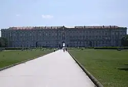 Das Schloss, das regelmäßig um vier Innenhöfe gruppiert ist und mit zwei breiten Fronten zur Stadt und zum Park aufwarten kann, gehört mit 1217 Zimmern zu den größten Barockbauwerken Europas. Die Fassade zur geplanten, aber nur in Grundzügen ausgeführten Stadt ist sehr streng gegliedert und erlaubt durch die mittlere Achse einen Blick auf den 3 km langen Schlosspark, der eine italienische Version eines barocken Gartens darstellt. Der Gartenbereich von Caserta ist als Bergpark ausgeführt und bezieht die gesamte Umgebung großflächig in die Architektur des Schlosses mit ein.