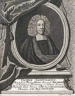 - Franz Xaver von Wegele: Sagittarius, Caspar (Historiker). In: Allgemeine Deutsche Biographie (ADB). Band 30, Duncker & Humblot, Leipzig 1890, S. 171.