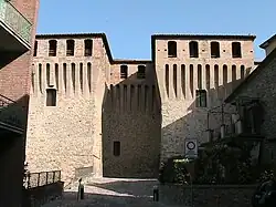 Der älteste Teil ist der große Turm an der Nordecke des Komplexes, der ursprünglich die Funktion eines Bergfrieds innehatte und das neuralgische Herz der gesamten Festung darstellt. Ursprünglich war er mit dem Rest des Gebäudes durch eine Zugbrücke verbunden, die später durch eine gemauerte Brücke ersetzt wurde. Im Erdgeschoss liegen die alten Gefängnisse, in denen 1442 Annibale I. Bentivoglio eingesperrt war.[11] Direkt damit verbunden ist der Saal im ersten Obergeschoss, der früher als Gerichtssaal diente. Im zweiten Obergeschoss liegt die Schlafkammer des Burgherrn, wogegen sich im obersten Stockwerk das Zimmer der Dienerschaft findet, das damals auch als Kornspeicher genutzt wurde. Ganz oben verläuft der Wehrgang, der höher liegt als der Rest des Gebäudes.[1]