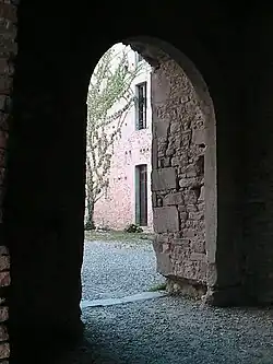 Heute ist der Bergfried von einem kleinen Garten umgeben, der ihn mit dem Innenhof verbindet. An den Ecken dieses Innenhofes sind noch die Öffnungen zu sehen, an denen früher der hölzerne Wehrgang mit beweglichen Leitern befestigt war, auf den zahlreiche Türen des ersten Obergeschosses führten; dieses war früher ohne jegliche Verbindung zum Erdgeschoss. Erst später wurde die große Treppe errichtet, die an der Innenseite des Bergfrieds hinaufführt.[1]