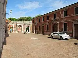 Auf der Westseite befindet sich das Eingangsportal, das von zwei Maschikulis und auf der linken Seite von einem halbrunden Turm mit zwei Arkaden geschützt wird. Es führt in den ersten mittelalterlichen Hof mit dreieckigem Grundriss, auf den die an die Festung und die Villa angrenzenden Wirtschaftsräume blicken, die durch vorspringende Abschlüsse an Hängebögen und Ziegelsteinen gekennzeichnet sind.