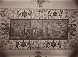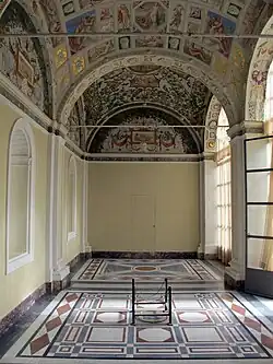 Diese Fresken und die der Kapelle wurden früher Peruzzi zugeschrieben, aber genauere Untersuchungen haben ergeben, dass sie von einem seiner Schüler, Giorgio di Giovanni, stammen. Sie wurden Ende des 19. Jahrhunderts von dem Maler Ernesto Sprega restauriert (an einigen Stellen ziemlich stark), dem das Verdienst zukommt, die „moralischen Übermalungen“ entfernt zu haben, die die eher ausschweifenden mythologischen Szenen verdeckt hatten. In der Mitte des Fußbodens befindet sich das Mosaikwappen der Familie Camajori.