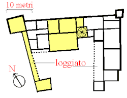 Auf der Ostseite des Innenhofes liegt eine Vorhalle mit Rundbogenarkaden und Kreuzgewölbedecke, unter der sich der Haupteingang zur Burg öffnet und von wo man auch ins Innere des Gebäudes eintritt. Die geometrische Verzierungen an den Rippen der Kreuzgewölbe sind typisch für die Kunst des 15. Jahrhunderts.[1]