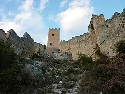 Der Turm ist eine Strebe, das heißt, mit einem Grundriss, der aus einem Quadrat und einem gleichseitigen Dreieck zusammengesetzt ist. Der Grundriss der Einfriedungsmauern ist dreieckig, wobei der Hauptturm an der oberen Ecke sitzt, und weitere, kleinere und zusammengestürzte Türme entlang den Mauern der Einfriedung.