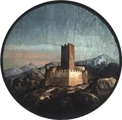 - ↑ Die vieleckige, fast kreisförmige Umfassungsmauer mit dem alten Bergfried in der Mitte zeigt vielleicht ästhetische Anklänge an das Schloss Introd.