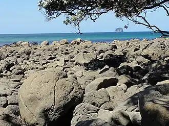 Die aus dem Pazifischen Ozean steil herausragenden Felseninsel liegt rund 6 km östlich des Hot Water Beach und erreicht eine Höhe von 59 m.[1]