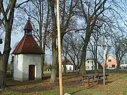 • Holzkreuz neben der Kapelle auf dem Dorfplatz